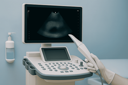 - С помощью датчика УЗИ проводится осмотр: датчик перемещают по коже, изображение выводится на экран.